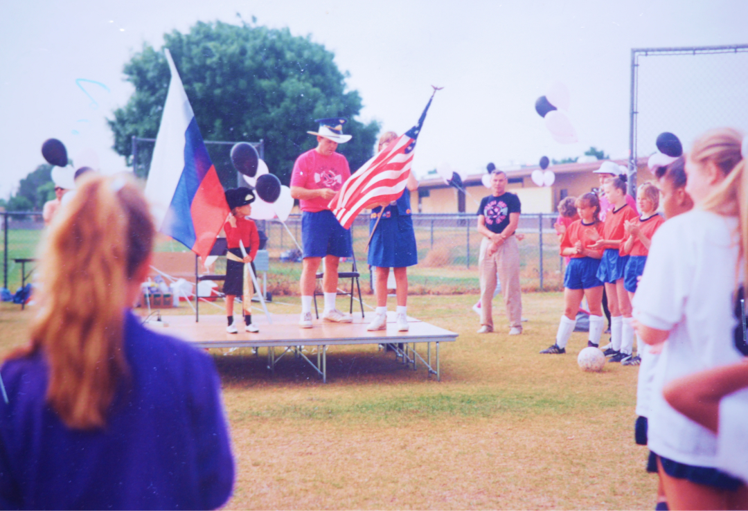 Турнир с участием команды «Сибирячка» (Красноярск) закончился. Игроки команды «Гласность» исполняют гимн. Калифорния, 1992 год.