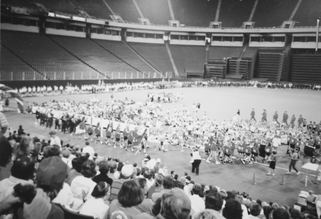 Торжественное открытие международного турнира среди мужских и женских команд. Парад участников в Спортхолле города, который использовался для игры в бейсбол. Всего в нем приняло участие 640 команд. Минеаполис, июль 1992 года.