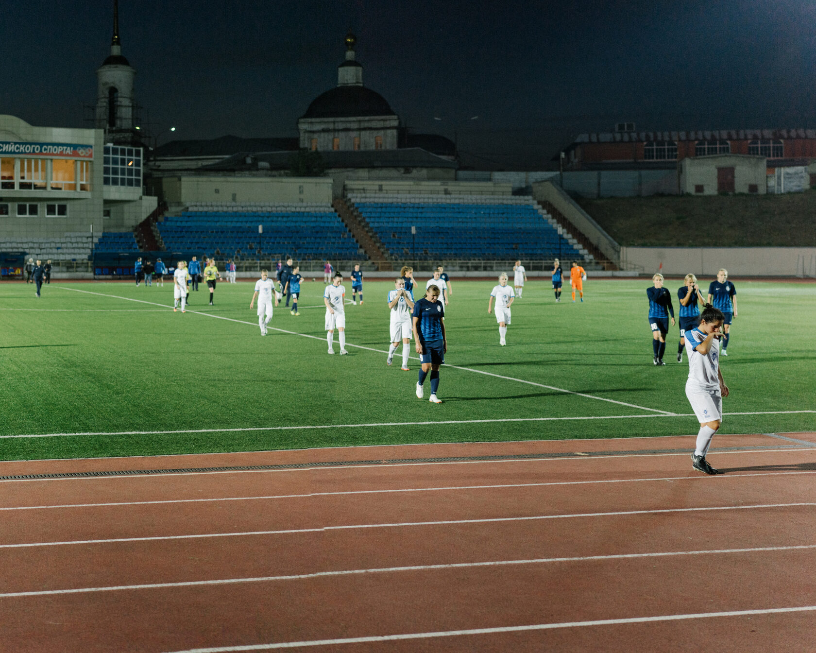 Футболистки клуба ЖФК Чертаново и ЖФК Рязань-ВДВ уходят на перерыв после первого тайма 20 сентября 2018 года